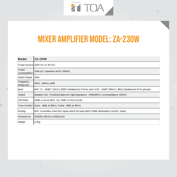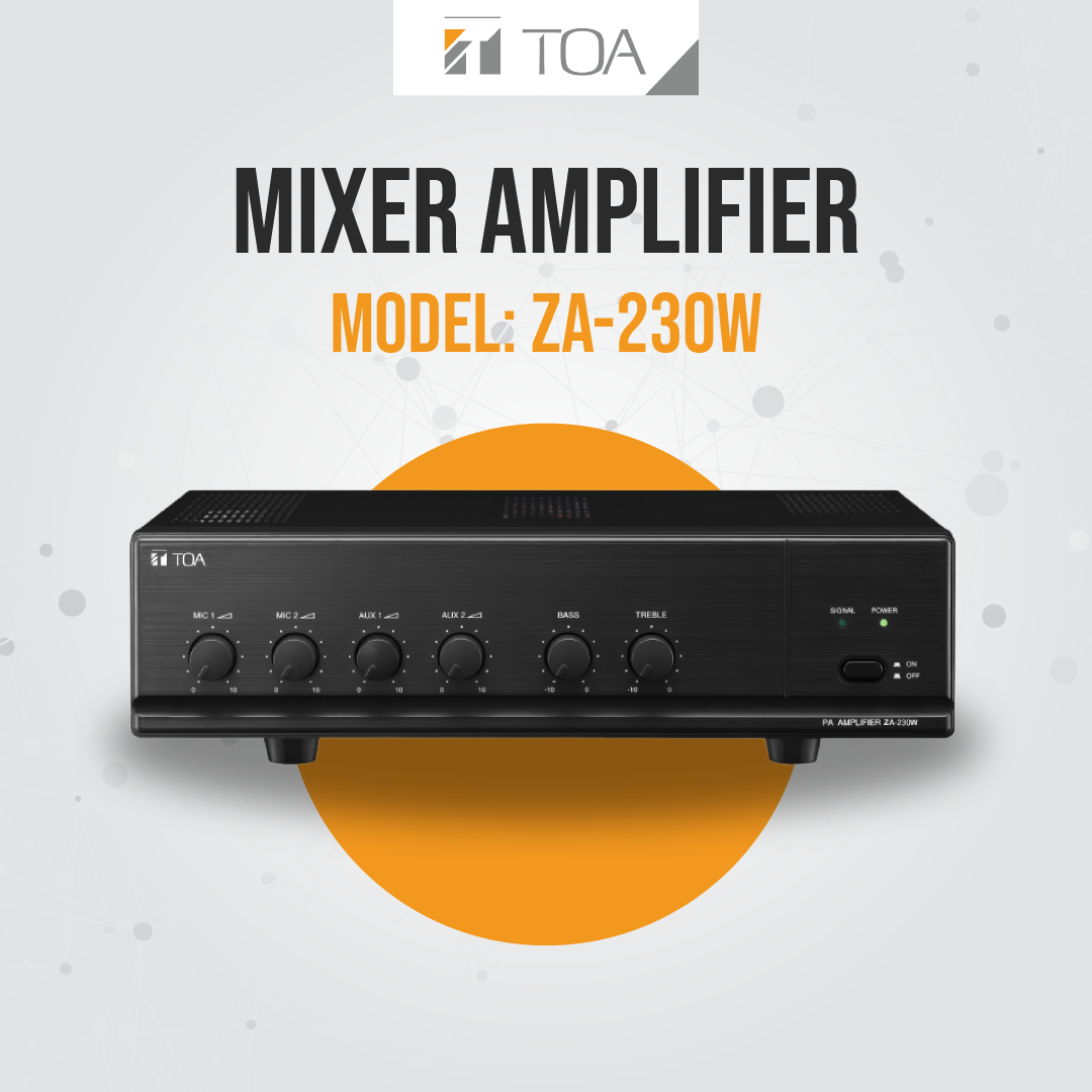 MIXER AMPLIFIER TOA Model ZA-230W, dirancang untuk memenuhi kebutuhan mengatur suara seperti paging, orasi, upacara, antar komunikasi, tempat ibadah, carcall, dan lain-lain.
