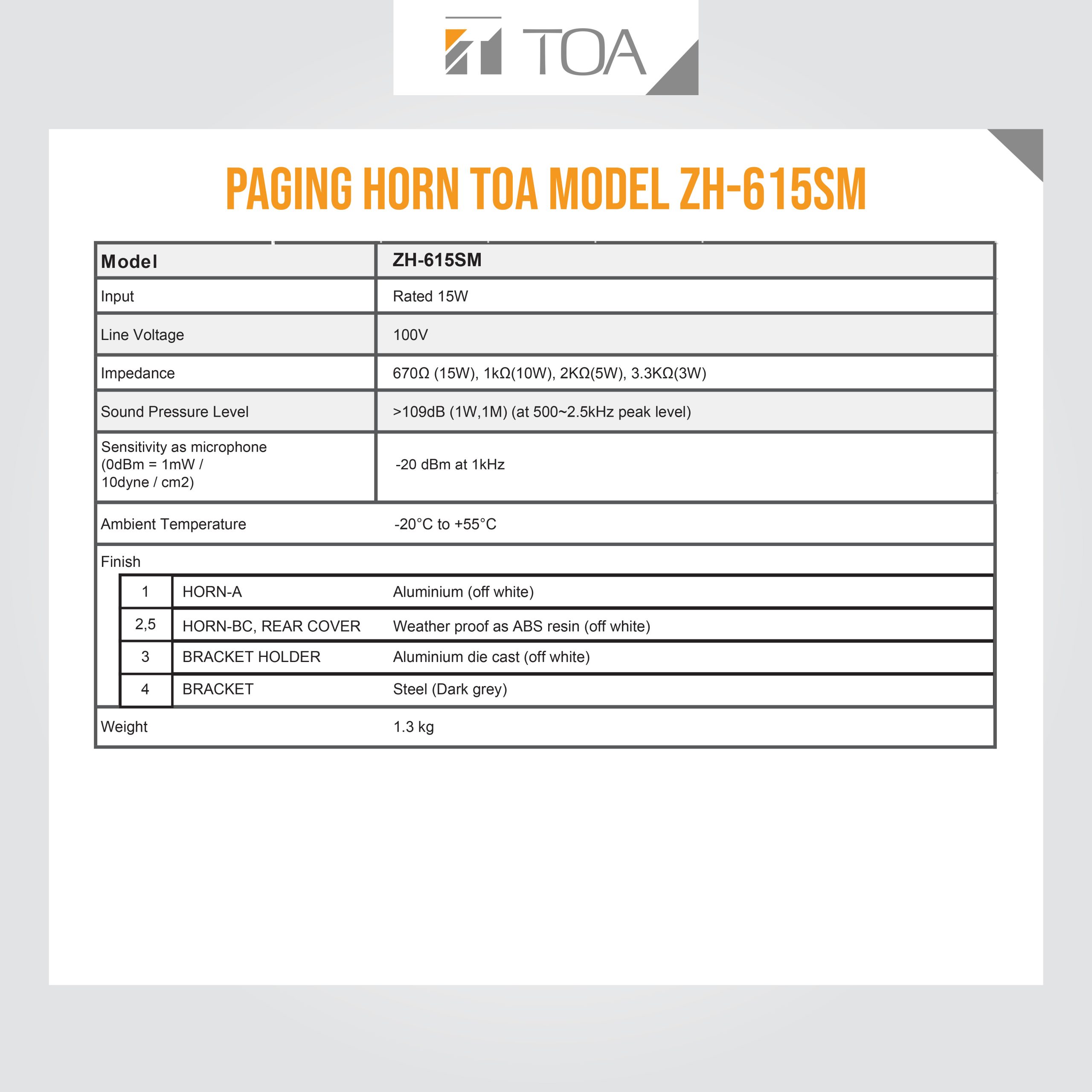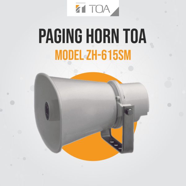 PAGING HORN TOA MODEL: ZH-615SM adalah speaker yang ringkas dan sangat jelas untuk digunakan sebagai pengumuman. Komponen speaker eksternalnya dilapisi pelindung, dan braket dan sekrup stainless steel bisa tahan.