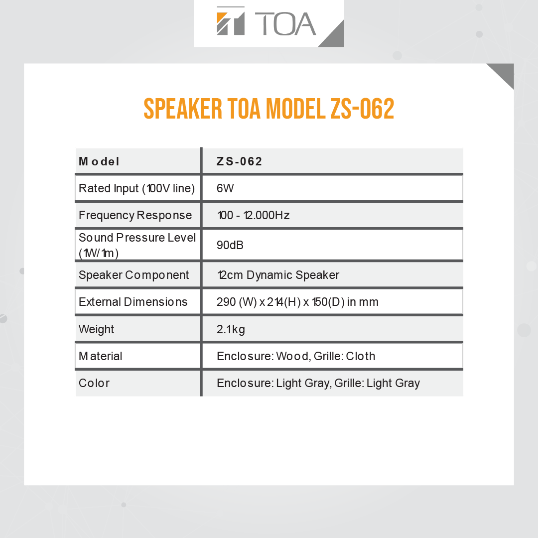 SPEAKER TOA MODEL ZS-062 adalah Speaker dengan jangkauan luas untuk paging suara, musik latar dan vokal.