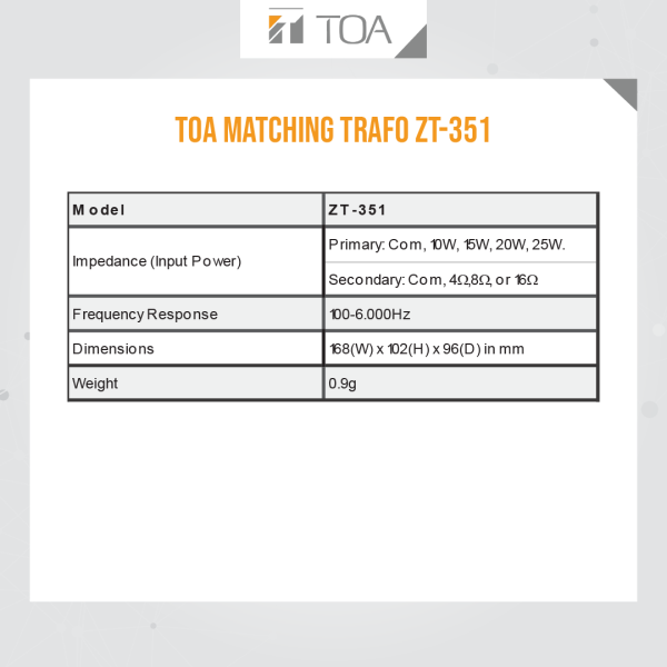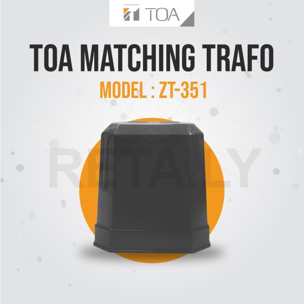 Matching Trafo ZT-351 adalah peralatan tambahan yang digunakan untuk modifikasi dari speaker horn / speaker corong TOA dari low impedance menjadi high impedance. Cocok digunakan pada speaker yang jaraknya jauh dari Amplifier.