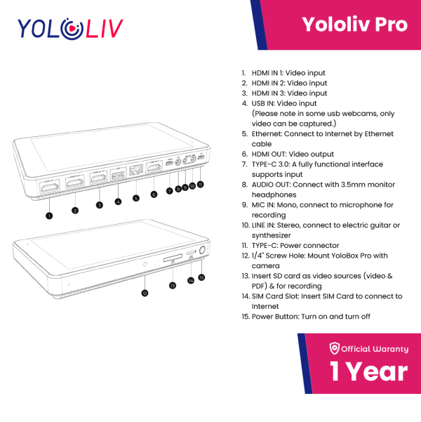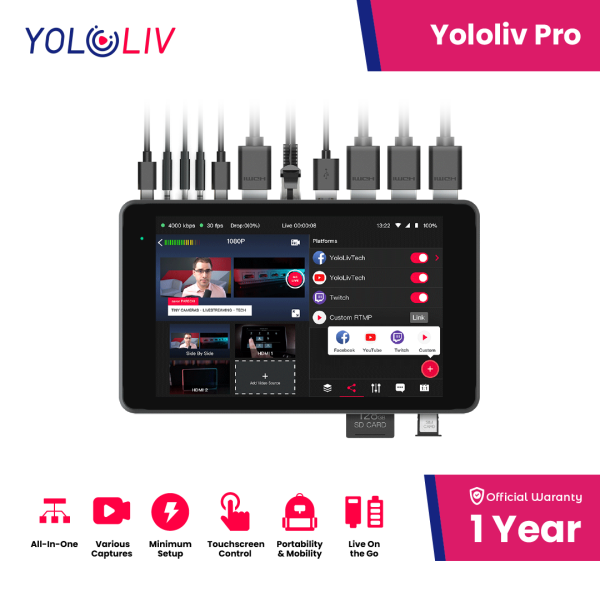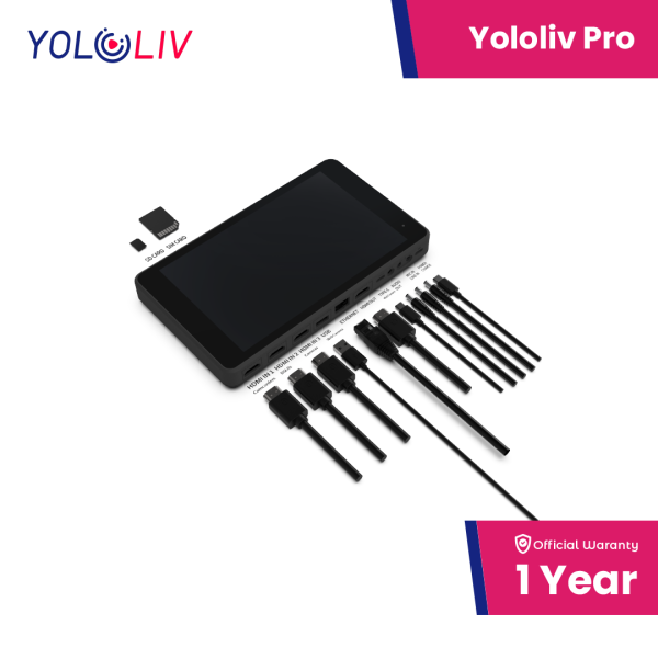 YoloBox Pro memungkinkan Anda untuk terhubung dan langsung beralih hingga 10 sumber video, dan kemudian terhubung ke jaringan area lokal melalui Wi-Fi, Ethernet, atau LTE (koneksi LTE memerlukan kartu SIM dan paket data tidak disertakan). Layar sentuh 8″ yang besar menunjukkan gambar streaming, input stream, serta antarmuka kontrol, yang memungkinkan Anda beralih di antara sumber info dengan sentuhan. Ia juga dilengkapi output HDMI untuk menampilkan streaming Anda secara lokal pada layar HDMI opsional Ini juga memiliki input audio level-line, input audio level-mikrofon, dan output audio headphone diskrit.